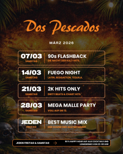 Jeden Freitag und Samstag ab 22 Uhr legt unser DJ auf, mit wöchentlich wechselnden Musik-Mottos und Special-Angeboten. Neu: Unsere Mega Party Karte bietet 1-3-5-Liter Drinks. Genießen Sie außerdem 50 % Happy Hour auf alle Cocktails und Longdrinks von 23-00 Uhr. Wir freuen uns auf Ihren Besuch!